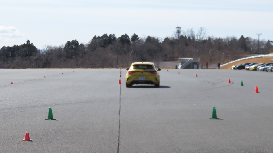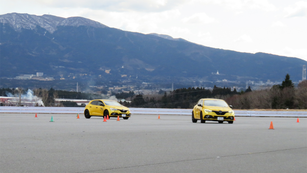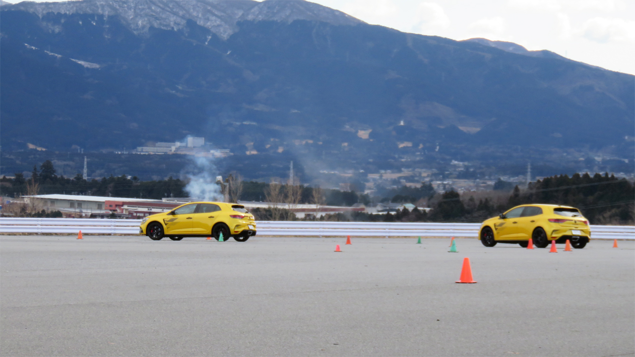 4コントロール装備のメガーヌRSウルティムをフィーチャーした2月のYRSドライビングワークショップFSW。カリキュラムはいつも通り午前中にスラロームと2種類のブレーキング練習。午後は設置したコーンのレイアウトを変更してオーバルコースを走ってもらった。