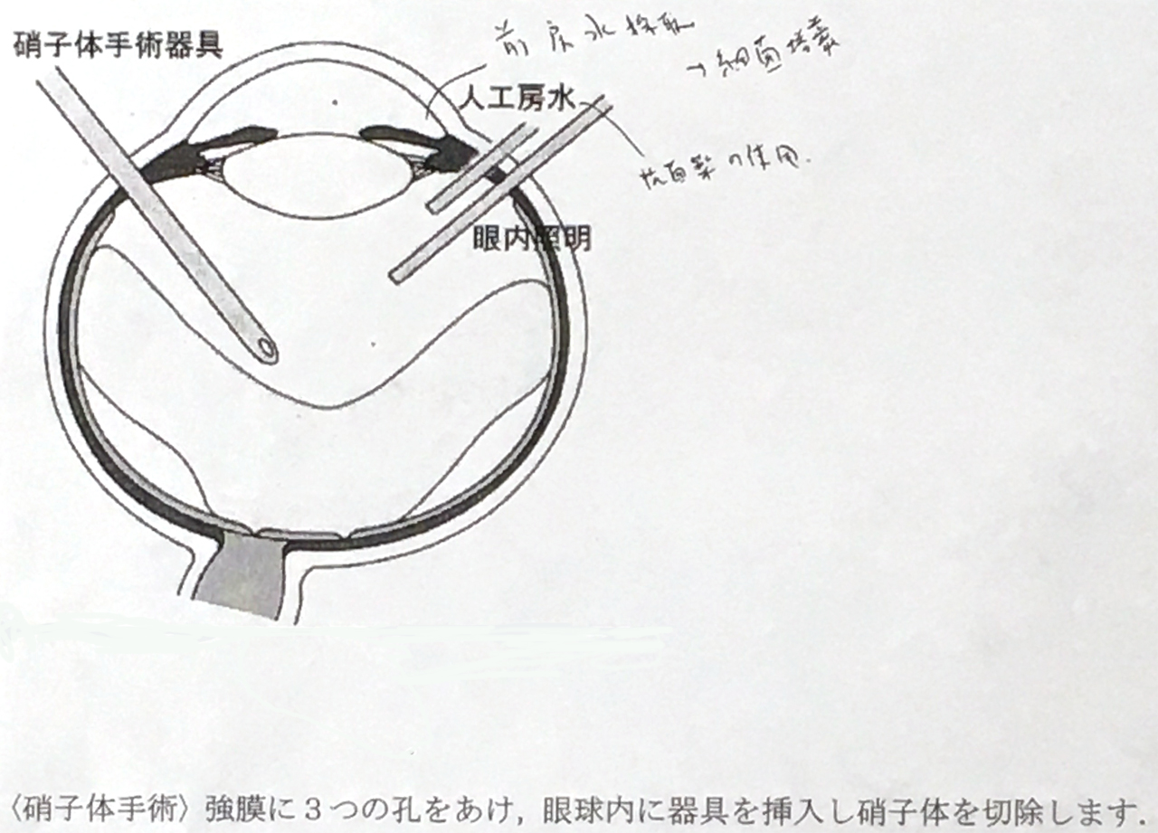 手術前に森先生から右眼内レンズの摘出と右眼硝子体の切除を行うと説明があった。角膜の周囲を切開して眼内レンズを切除し、強膜に3つの穴をあけ器具を挿入して硝子体を切除するという。初めてのことばかりで診察から手術台に乗るまであれよあれよという感じで、けれど、消毒液を絶えずかけられているからはっきりとモノが見えない右目に激痛は走った。