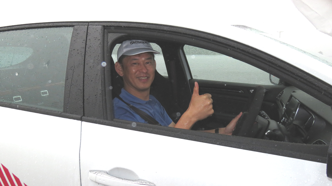 最後に「Neutral」モード。これにはびっくりです。電子デバイスが全てを上手に制御してくれました。ターンインの初めにアンダーステアさえを出さなければ、水深1㎝のような最悪のコンディションの中をまるで線路が敷かれているように何事もなく相当の速さで走ってくれます。思わず「何だこりゃ!スゲーー!」と大笑いしてしまいました!コーナーリング中はどこの車輪をどのように制御しているのか分からないほど細かく細かくコントロールしているのでしょう。アクセルを踏めば踏んだだけ前に出ますし、それでいてグイグイ曲がってくれます。立ち上がりでアクセル開度を大きくするとホイールスピンを最小限に抑えつつ加速してくれました。あの路面コンディションでは考えられないほど高次元で走ってくれました。「メガーヌすげー!」「トロフィーすげー!」です。ウルゴンがドライブしても、私がドライブしてもおそらく差が無いくらい本当によく出来ていると感心させられました。このモードが私には一番印象深く、メガーヌ買っちゃうかな!?とちょっと思ってしまいました。
