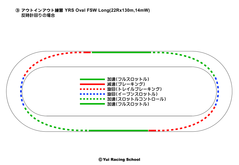 次に小さなオーバルをインベタで走ってトレイルブレーキングの練習をします
