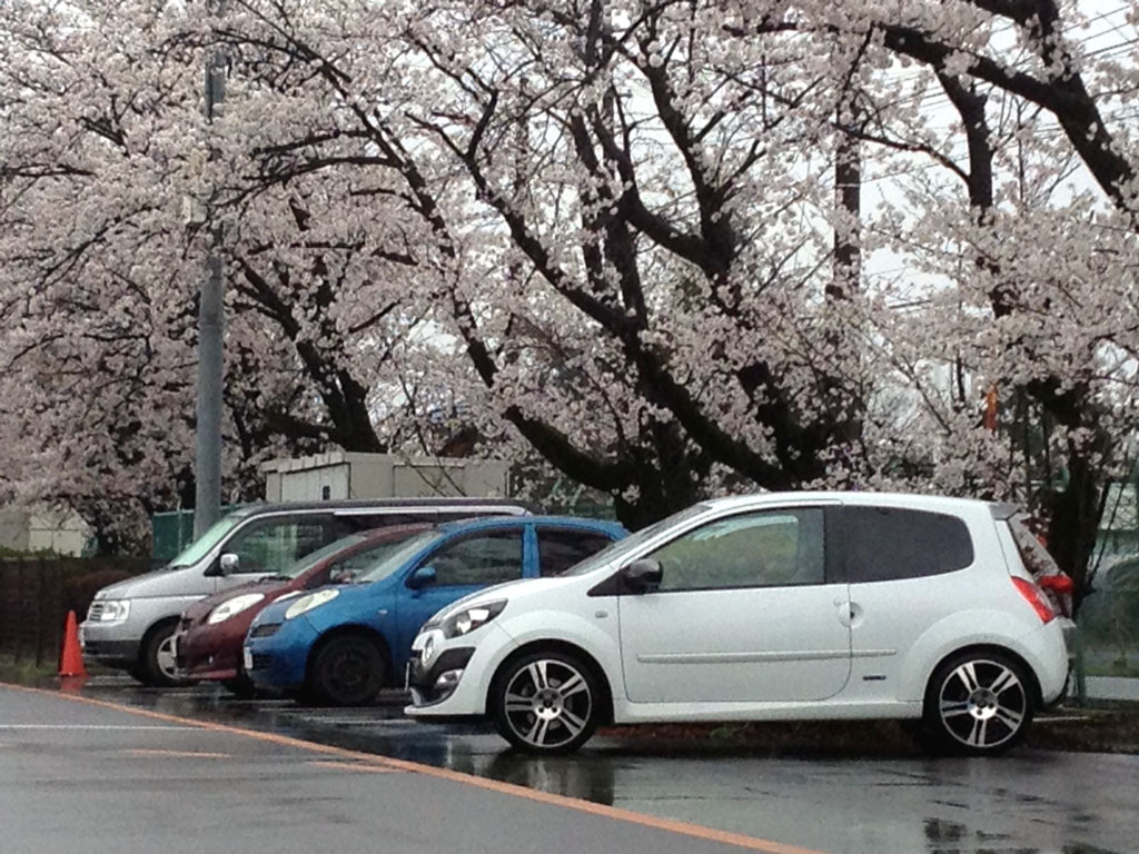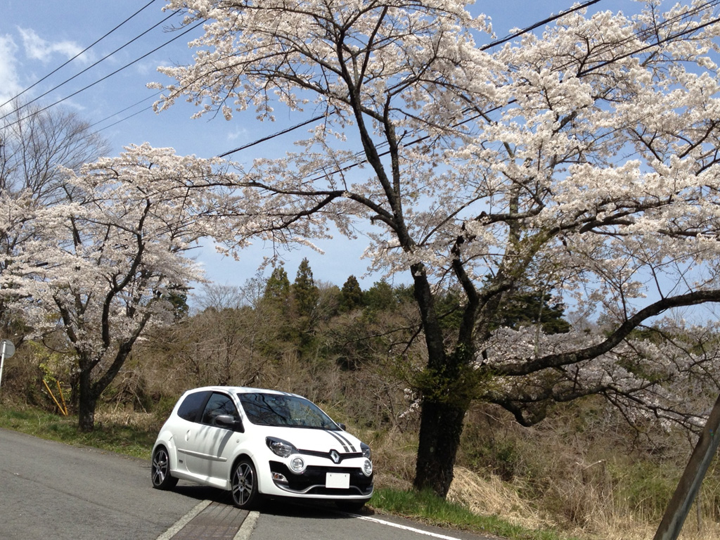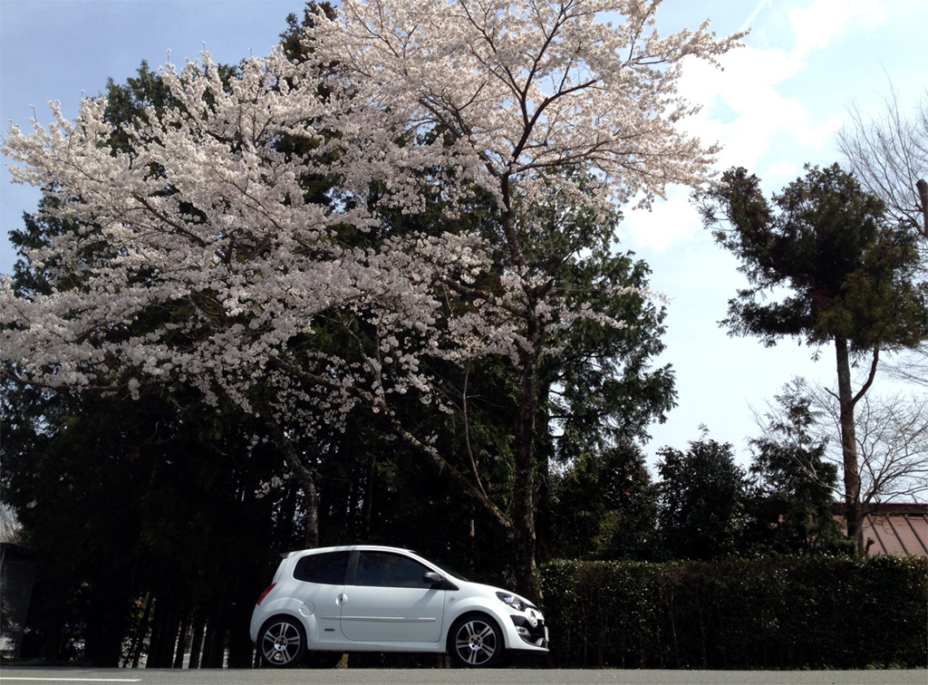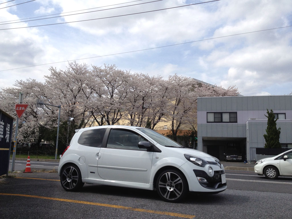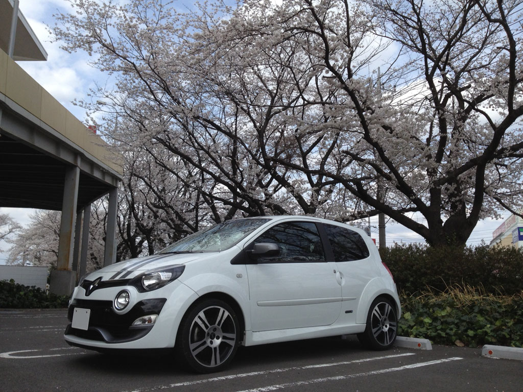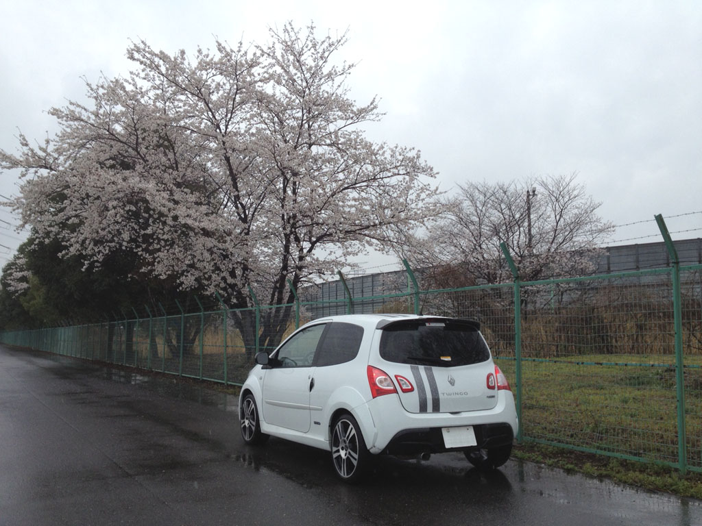 桜の木の下で。この時ばかりは白いトゥィンゴ ゴルディーニ ルノー・スポールで良かったなと。