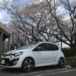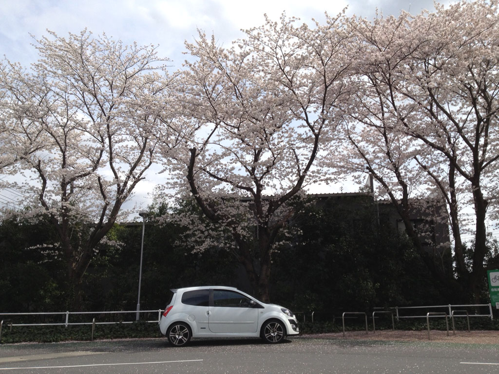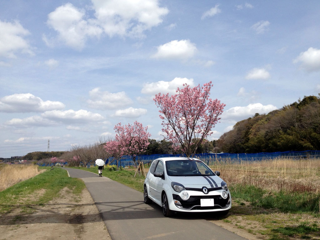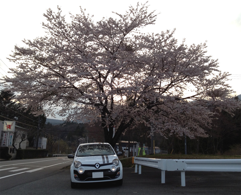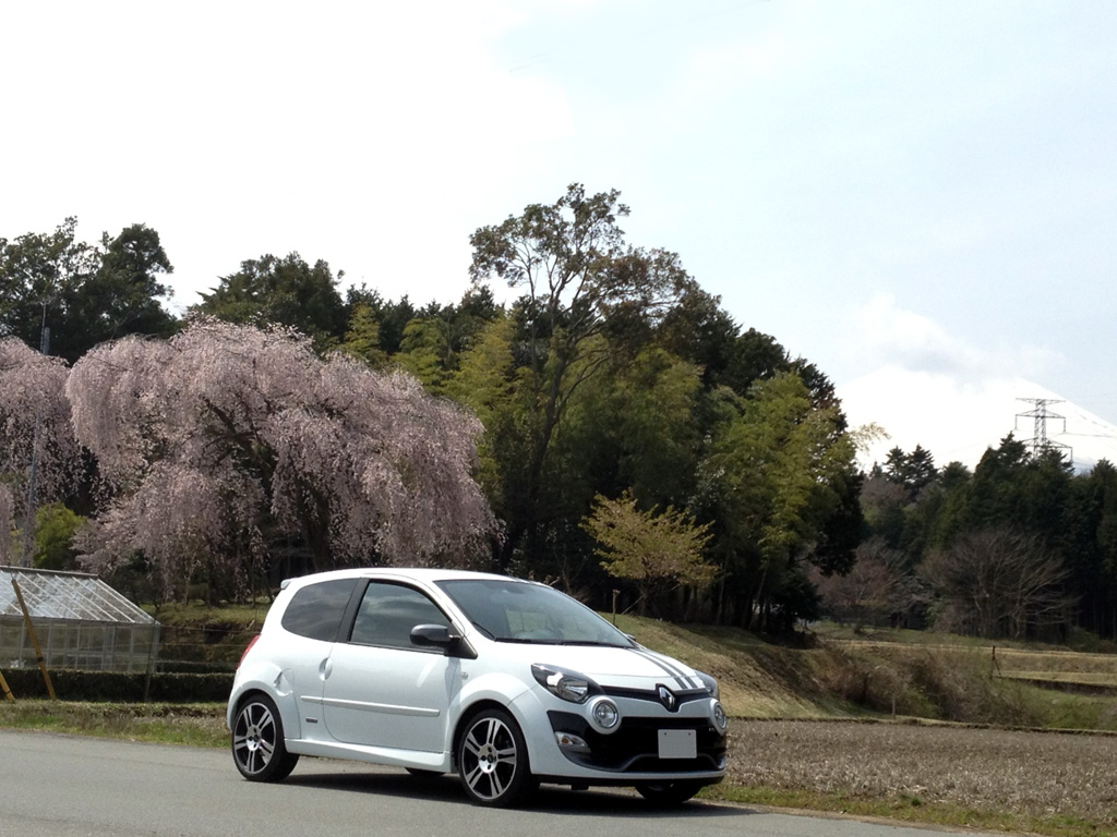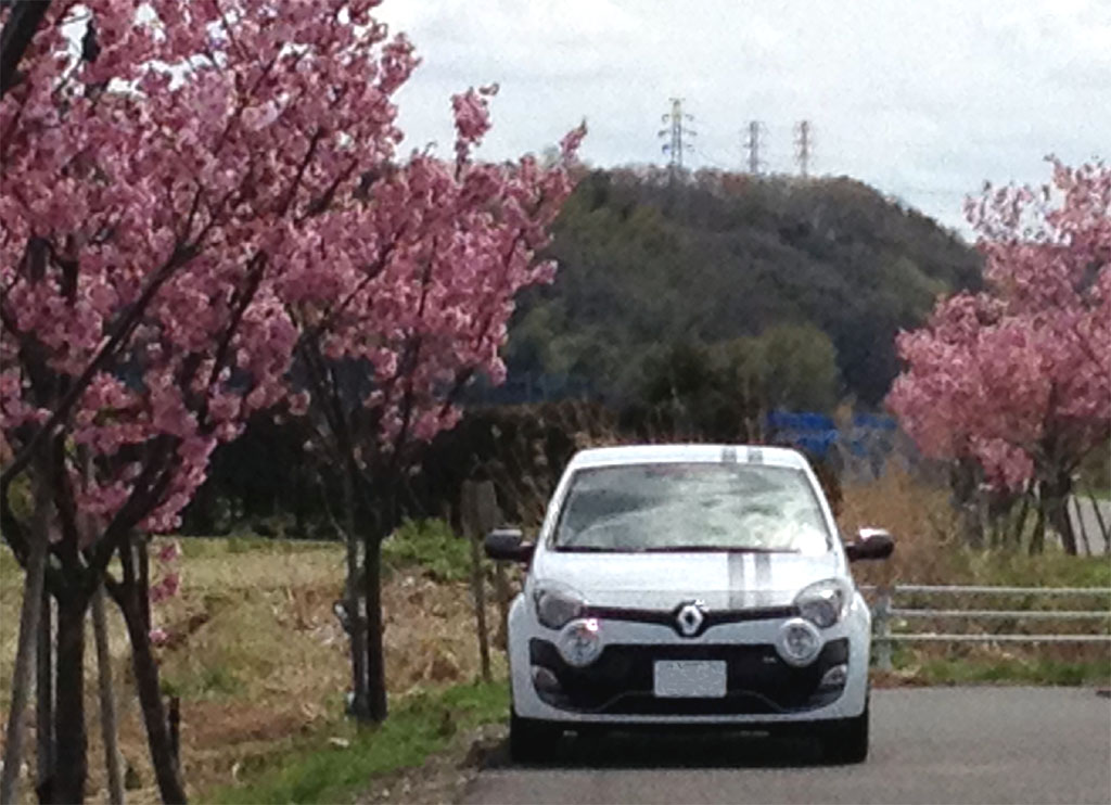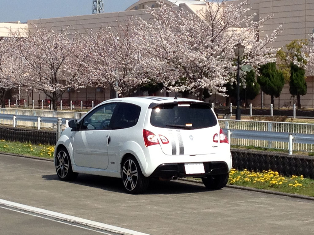 桜の木の下で。この時ばかりは白いトゥィンゴ ゴルディーニ ルノー・スポールで良かったなと。