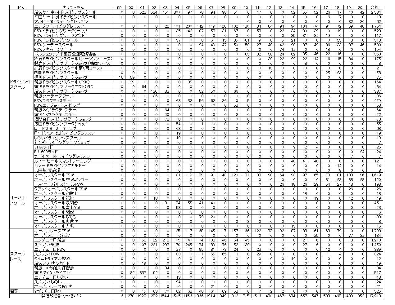 1999年~2020年ユイレーシングスクール参加者数サマリ(ダウンロード用pdfファイル)