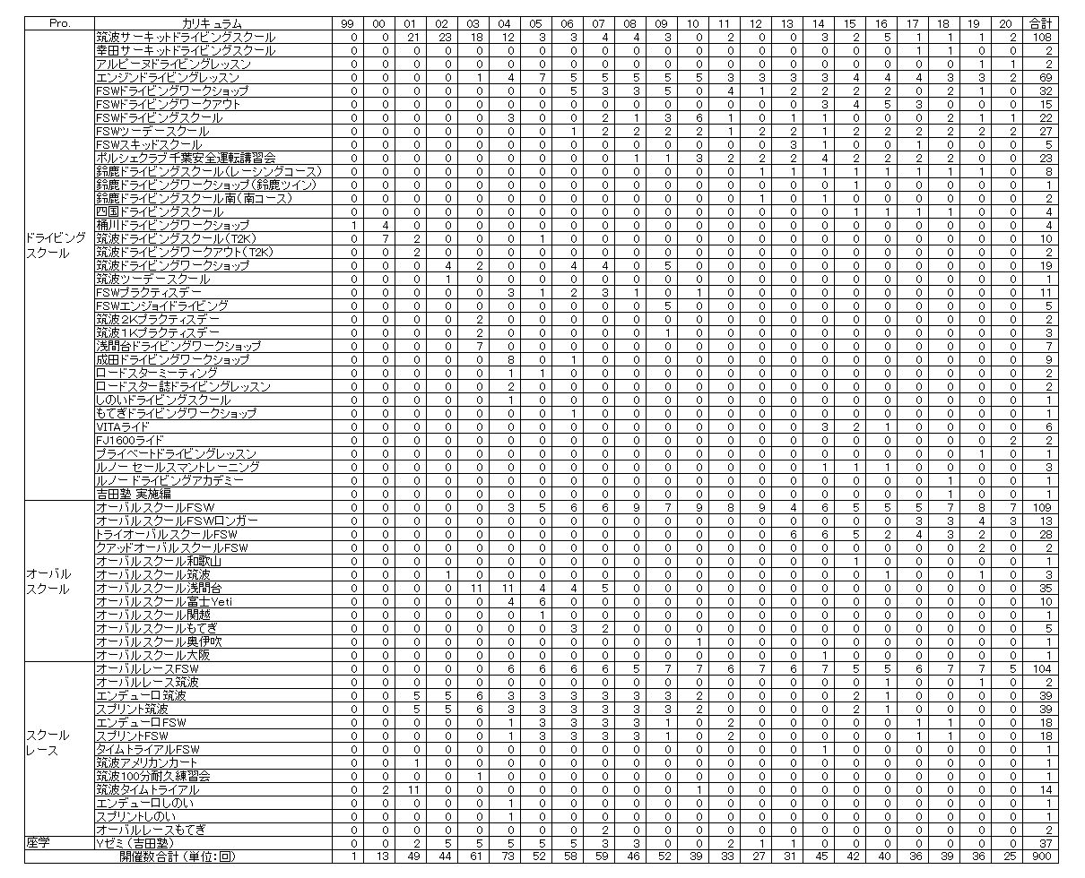 1999年~2020年ユイレーシングスクール開催数サマリ(ダウンロード用pdfファイル)