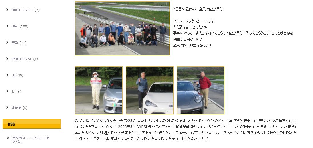 Oさんは2003年5月。55歳の時に筑波サーキット公式ドライビングスクールで初めてユイレーシングスクールに参加してくれた。2006年に始めて今年3月までに19回開催したYRSツーデースクールFSWには2011年11月に初めて来てくれた。2015年の年末に開催したYRSツーデースクールFSWを欠席した以外は18回参加。2016年からは皆勤賞。その他にもYRS筑波サーキットドライビングスクールやYRSオーバルスクールFSWにも参加してくれて計82回ユイレーシングスクールに参加してくれた。70を過ぎてからは自慢の愛車に高齢者マークを貼って、若者に負けない速さを見せつけてくれていた。