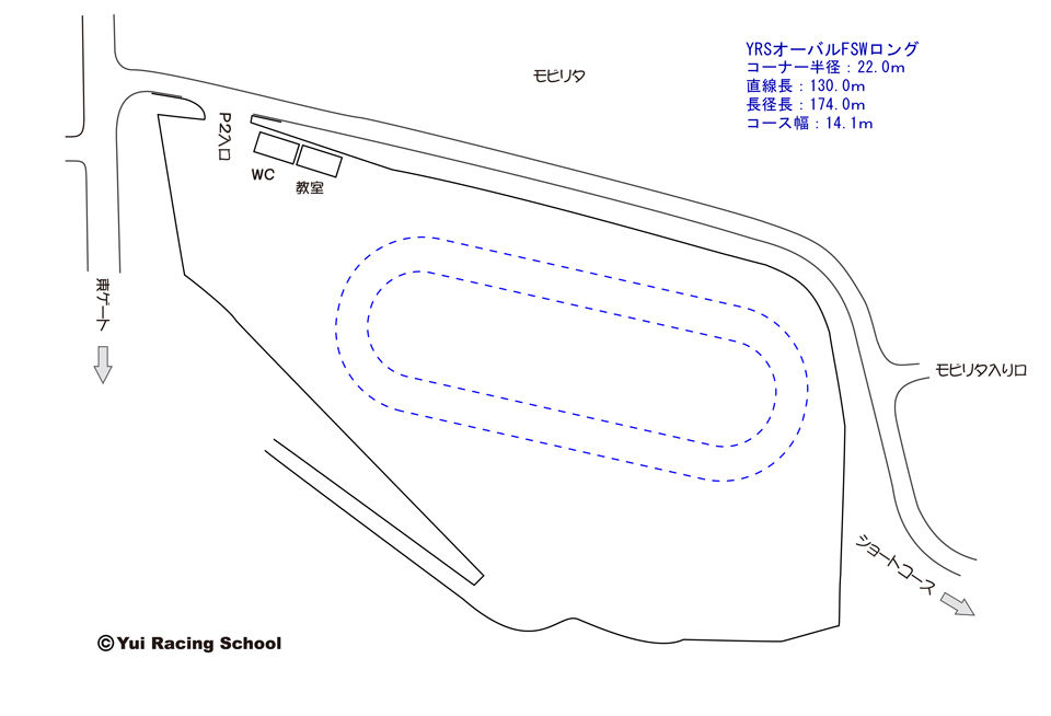 ユイレーシングスクールの活動の骨格をなすYRSオーバルスクールFSWはコーンを立て、図のようなオーバルコースを作って開催します。基本的には半径22m直線130mのYRSオーバルFSWロングを使いますが、コース幅は14.1mもあります。車線の区分線が描いてないのでにわかには信じがたいですが、高速道路の1車線は幅3.5mですから3車線の高速道路より幅が広いのが特長です。アウト側のコーンの外側にも十分なエスケープゾーンを設けているので安全性は十分に確保してあります。アメリカ製の軟質PVCのコーンを使っているので、コーンと接触してもクルマに傷はつきません。
