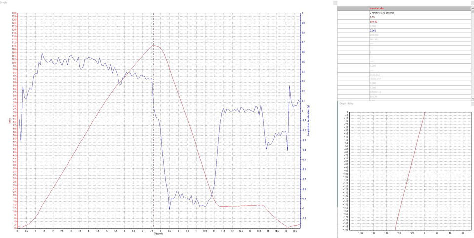 スタート後7.40秒でこのランの最高速度110.30Km/hを記録