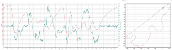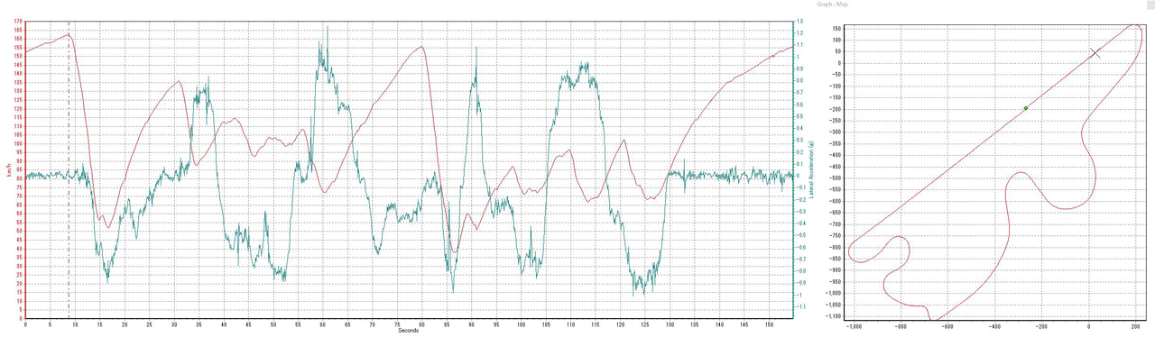 1コーナーの最大横向き加速度は0.847G、100Rが0.847G、ヘアピンが1.209G、ダンロップコーナーが0.962G