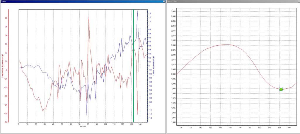 見難いかもしれないが、図は左の座標が加減速Gで赤い折れ線グラフで増減を、右の座標は横Gで青い折れ線グラフで表示している。軌跡上の緑の丸がクルマの位置、グラフの中にある緑の縦線が対応するクルマの加速度を示している。ちなみにグラフでは、加減速Gがゼロを基点に最大0.7Gとマイナス0.6G、横Gは同じくプラスマイナス1.4Gを表示している。