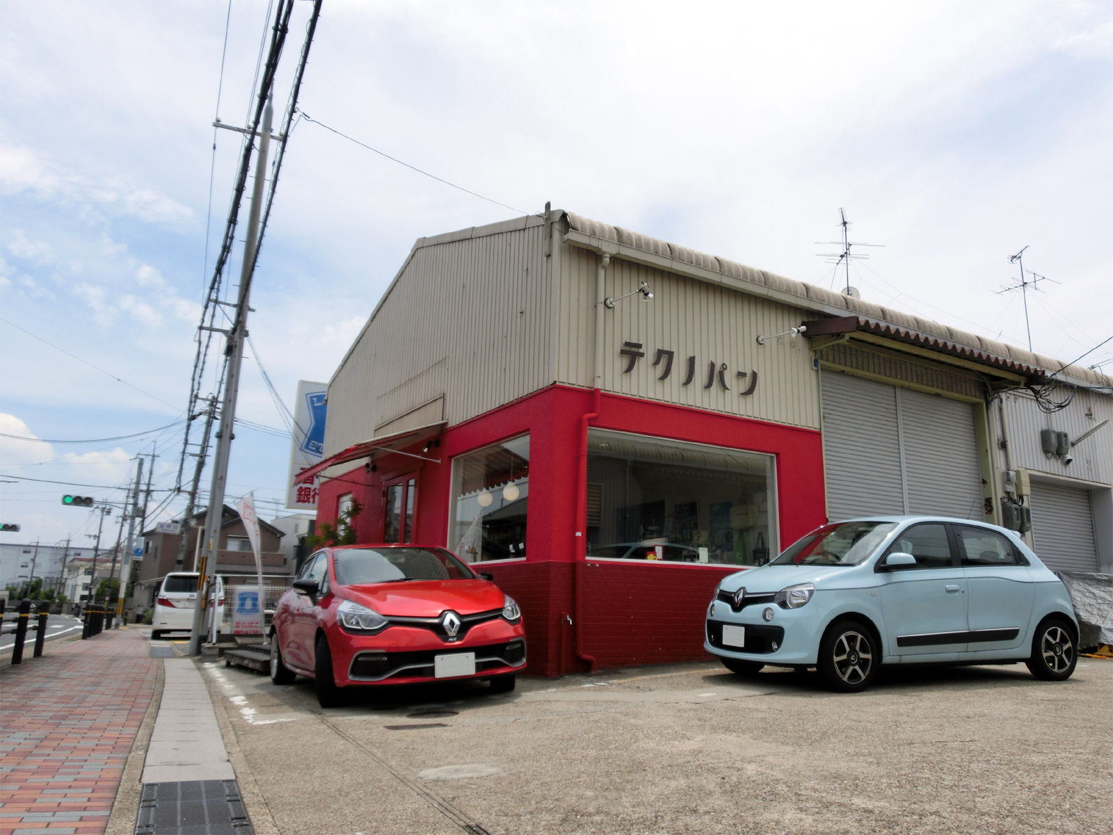 京滋バイパス下りを久御山淀(くみやまよど)で降りて側道を300mほど走り、北川顔(きたかわづら)の信号をを左折。200mぐらいで右手に赤い帯に大きな窓の建物が現われる。バイパスを降りてからものの4分。そこが今回お邪魔したテクノパン。