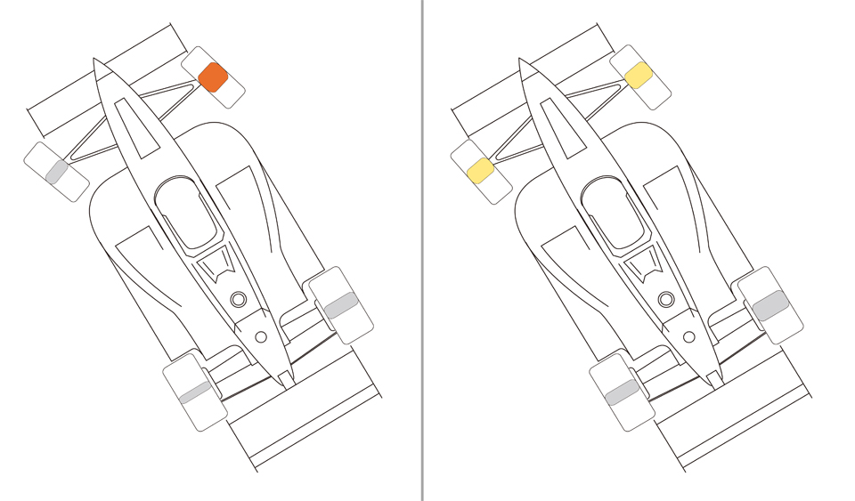 アウト側前輪に集中しイン側前輪はロールによってリフトする