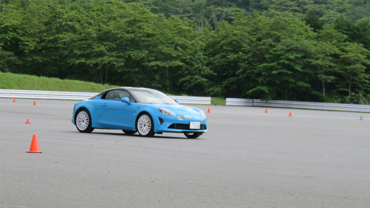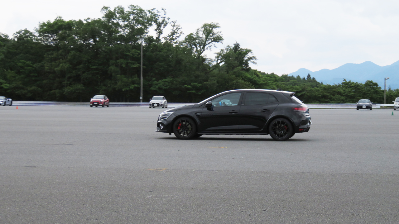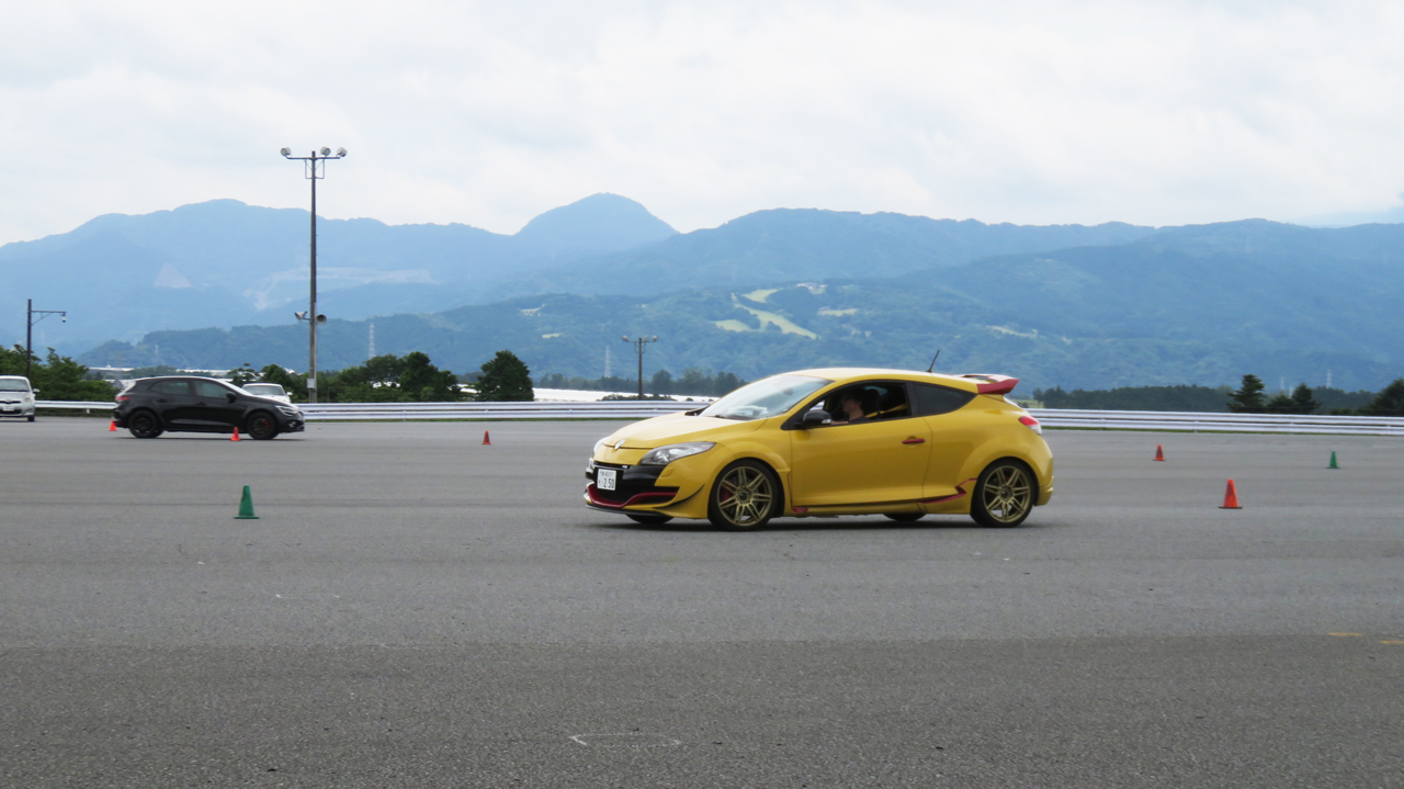 今回唯一のルノー乗りのEさんがビッグブレーキに挑戦します。100キロプラスからできるだけ短い距離でクルマを静止させる練習。ブレーキペダルの踏み方で制動距離が大幅に異なることを体験します。