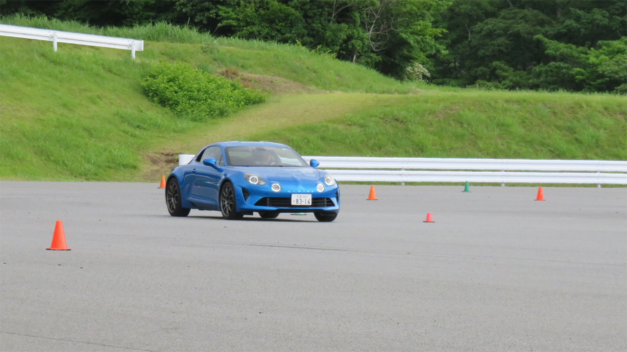Eさんが20m間隔においたコーンのスラロームコースを駆け抜けます。クルマは連続した切り返しが苦手です。切り返しを連続するのではなく一瞬がフラットな状態をはさんでやることでクルマが走りやすい状況を作ります。